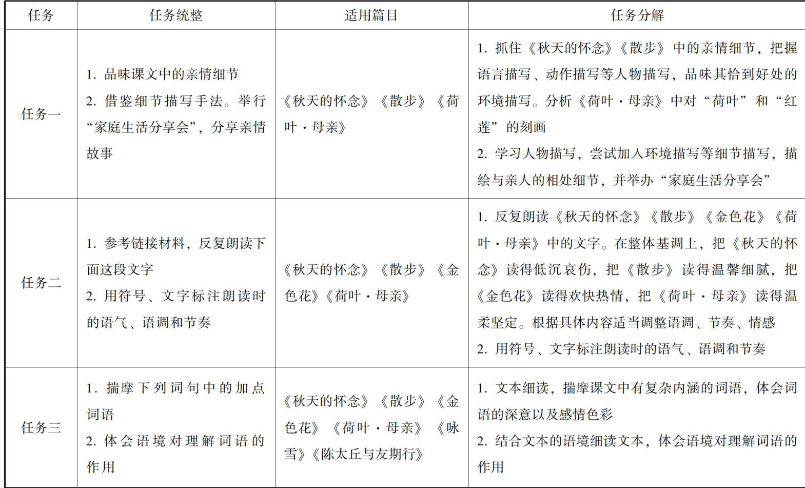 [摘要]“阅读综合实践”板块的设置是新修订统编版教材中的一大亮点,给一线语文教学带来全新挑战。故探讨增设这一板块的意义,并在具体实施上提出灵活嵌入、任务驱动的“阅读综合实践”前置模式,以七年级上册第二单元为例,采取任务统分策略——依托课标和教材,统整任务核心要素,立足各篇文本特质,精准定位课文联结点,分解、细化任务实施内容,同时,使用任务优化路径—补充知识基础、创设真实情境、提供学习支架、明确任务步骤与成果产出,以期提升“阅读综合实践”板块任务的适切性与可操作性。