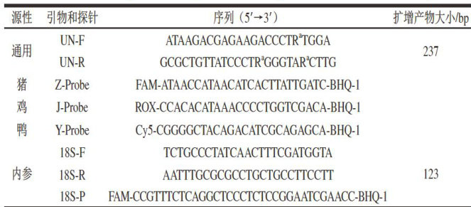 摘要:为应对鸭血制品中动物源性成分的掺杂问题,基于TaqMan探针多重实时荧光定量聚合酶链式反应(real-time fluorescence quantitative polymerase chain reaction,real-time PCR)技术开发一种可同步检测猪、鸡和鸭源性成分的高效检测方法。该方法针对上述物种线粒体16SrDNA基因的保守区域设计通用引物(UN-F/R),并在其可变区域设计特异性分子信标探针(Z-Probe、J-Probe、Y-Probe),通过优化反应条件及验证实验(特异性及灵敏度),建立多重real-time PCR检测体系。为评估市场掺假现状,采集本地19份散装鸭血制品进行检测。结果表明,本方法能够在单管反应中同时检测并区分猪、鸡和鸭源性成分的荧光信号,展现出较高的特异性和灵敏度,其在鸭血制品中灵敏度达 0.06ng/μL ,检出限为 10.10% 。实际样品检测显示,19份鸭血样品中1份检出猪源性成分,11份检出鸡源性成分,12份检出鸭源性成分,与GB/T38164—2019《常见畜禽动物源性成分检测方法实时荧光PCR法》方法结果一致,但本方法灵敏度更高。因此,本研究建立的方法能有效、准确地鉴别鸭血制品中的猪、鸡源性掺杂成分,为多物种源性鉴别提供了准确、可靠的技术方法。