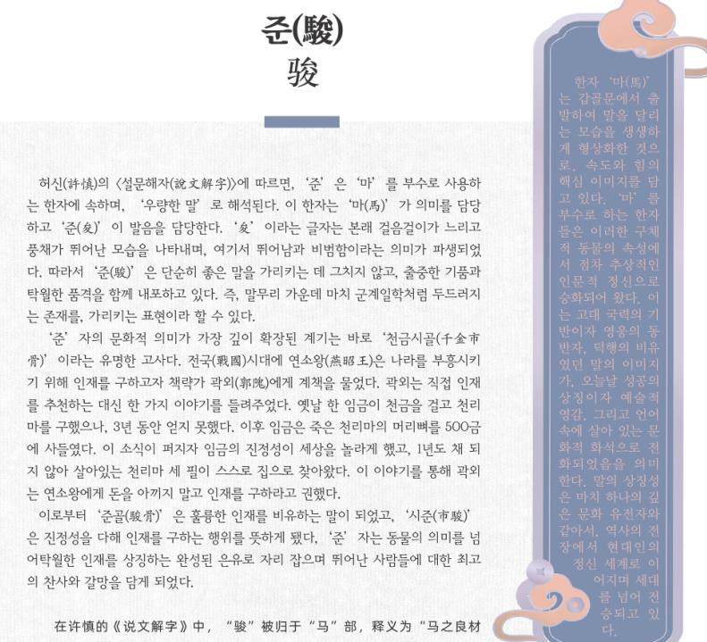 (駿)骏 在许慎的《说文解字》中,“骏”被归于“马”部,释义为“马之良材者”。其字形结构为“从马,矣声”。“矣”字本身即有行步舒缓、风度翩翩的意态,引申为超凡、杰出之意。因此,“骏”从诞生起,便不只是形容马的优良,更暗含了一种出众的风神与高度的品格。它特指马群中犹如鹤立鸡群、卓然不群的精英,是“马”中最为挺拔优秀的代表。 “骏”字最深刻的文化升华,来源于“千金市骨”的著名典故。战国时期,燕