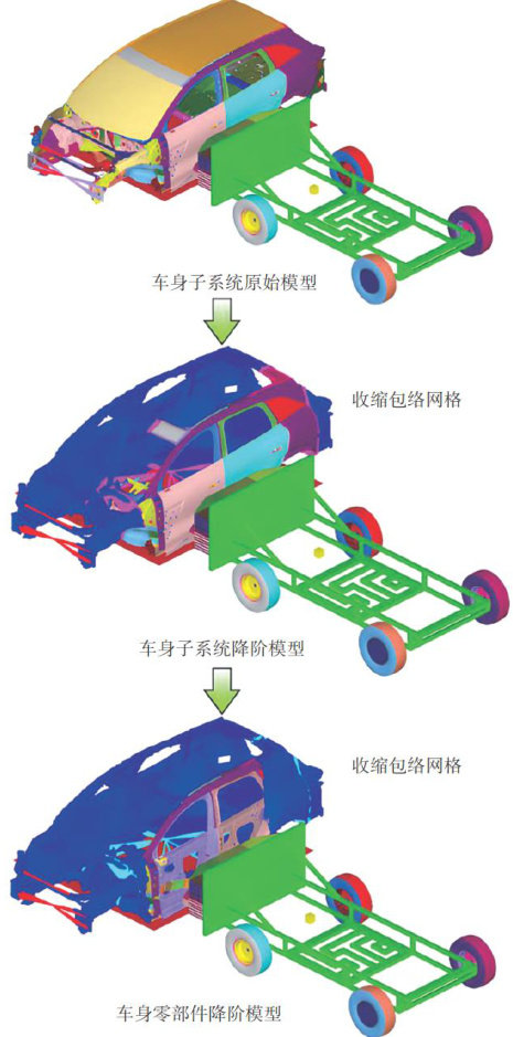 【摘要]针对整车碰撞仿真中计算成本高、效率低等问题,结合模型降阶技术和车身零部件仿真策略,提出一种高效的车身零部件性能仿真验证方法。将关键零部件置于车身子系统进行耐撞性仿真验证,通过将车身置于刚性地面,设置接触和摩擦因数,复现整车运动姿态,以保证仿真精度;利用收缩包络网格替代非撞击侧车身结构,大幅减少单元网格数量,实现模型降阶和计算效率提升。试验结果表明:降阶模型仿真效率分别提升约45倍,在保证仿真精度的同时,实现车身关键零部件仿真快速验证和优化。