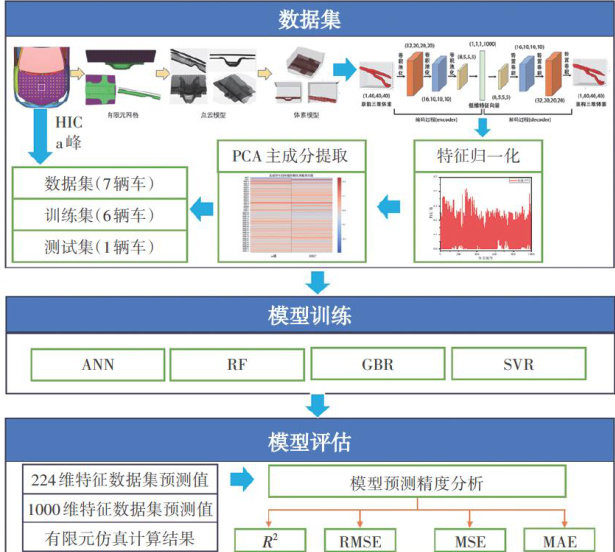 【摘要】为了快速评估车辆开发阶段不同车辆发动机罩板结构的行人保护性能,提出了一种基于三维体素数据的机器学习预测方法。首先,基于7辆车的有限元模型构建以罩板头部碰撞点为中心的三维体素数据集,精确表征罩板的复杂三维结构;其次,利用3D-CNN自编码器对三维体素数据进行无监督特征学习,生成1000维的编码数据集;随后,通过PCA线性降维技术过滤噪声特征,得到224维PCA数据集;最后,对比数据集在4种机器学习模型上的性能。试验结果表明:224维PCA数据集的预测效果更优,其中,SVR模型对HIC和a峰的预测决定系数 R2 分别达到 98.86% 和 98.44% ,显著提升了预测精度和泛化能力。此外,单辆车超过100组碰撞点的计算时间缩短至10s内,大幅提高了汽车安全性能开发效率。