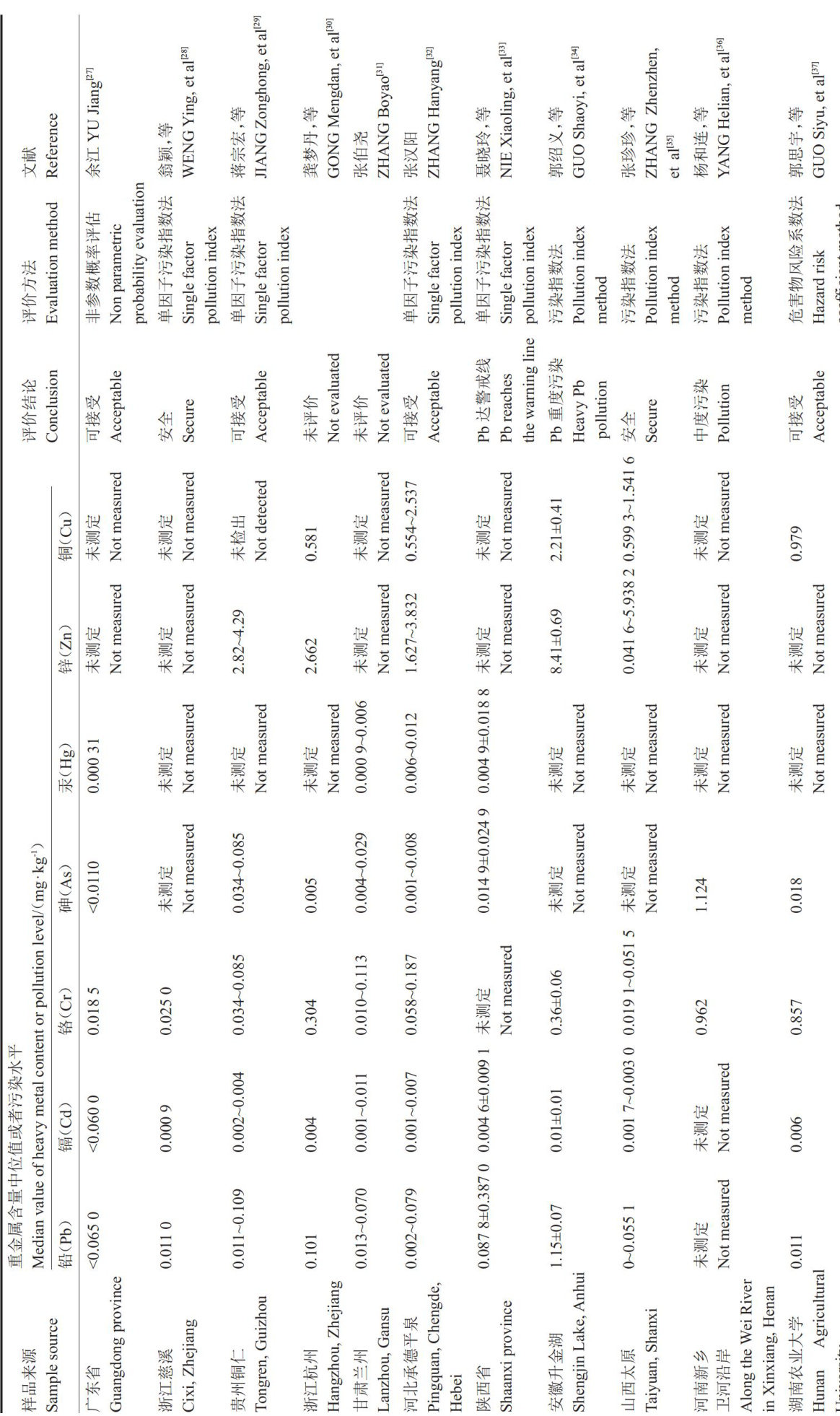 摘要:为探究设施菜地表层( 0~20cm. 土壤重金属的污染程度及对人体造成的健康风险,本试验选取陕西省典型的设施蔬菜种植区(泾阳县、三原县、富平县和高陵区),采用内梅罗综合污染指数法、潜在生态风险指数法及健康风险评估模型,开展土壤重金属污染评估和健康风险评估。结果表明,研究区表层土壤8项重金属Cd、As、Pb、Cr、Cu、Zn.Ni.Mn 的含量皆高于背景值。Cd、As含量均超出风险筛选值,Cd、As综合污染指数评价均为轻污染,其余重金属均为安全等级。研究区综合潜在生态风险指数为127.34,为低生态风险。随着种植年限的延长,研究区表层土壤重金属的含量存在差异,整体呈增加趋势。相关性分析和主成分分析结果表明研究区设施菜地 Cu,Zn,Pb,Cd 来自农业投入品,Ni和Cr为自然源,As有以上2种来源。研究区土壤重金属对人体不存在非致癌健康风险,存在可接受范围内的致癌风险,Cr和As对人体健康风险的贡献率最大。