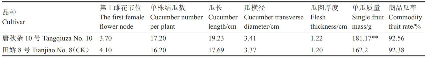 摘要:唐秋杂10号是以自交系H15为母本、L127为父本配置而成的杂交1代黄瓜新品种。该品种植株生长势中等,在唐山地区春秋大棚栽培全生育期140d,露地栽培全生育期约110d,第1雌花着生于主蔓6\~8节处,第1雌花以上节节着生雌花。单株结瓜15\~20个,主蔓、侧蔓均可结瓜;瓜呈棒状,瓜长度 18~20cm ,瓜横径3.0~3.5cm ,瓜肉厚度 1cm 以上,单瓜质量约 180g ,果肉中心可溶性固形物含量 (w ,后同) 4.5% ,维生素C含量0.2mg?g-1 。果刺呈白色、刺瘤大、刺稀疏,瓜皮翠绿色,瓜肉质脆、有清香味,高抗白粉病,中抗霜霉病,适合河北省露地和保护地栽培。2020年通过农业农村部非主要农作物品种登记。