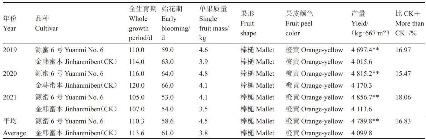 摘要:源蜜6号是以自交系S56为母本、自交系T32为父本配置而成的杂交1代南瓜新品种。该品种中熟,主侧蔓均可结瓜,以主蔓结瓜为主,连续坐果能力强,全生育期为105\~116d,始花期为53\~64d。植株长势强,第1雌花节位在18 节左右。果实棒槌形,果皮橙黄色,肉质甜面、味甘甜。田间表现高抗白粉病,瓜长 42.6cm 、横径 14~16cm ,果肉厚度 3.8cm ,单瓜质量 3.6~4.6kg ,平均 667m2 产量 4789.8kg 。可溶性固形物含量 Π(μ) ,后同) 7.52% ,蛋白质含量 0.63g?100g-1 ,脂肪含量 0.14g?100g-1 ,粗纤维含量 1.13g?100g-1 ,维生素A含量 0.59mg?100g-1 。丰产性好,适宜在我国贵州、四川、云南、湖南、广东等地种植。2025年7月通过湖南省农作物品种审定委员会专家现场评议。