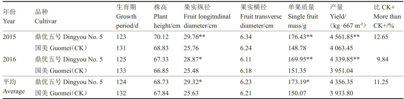 摘要:鼎优五号是以自交系 DP005 为母本、DP256为父本杂交选育而成的高产抗病辣椒新品种。该品种在黄淮海南部地区早春露地栽培全生育期为124d,植株生长势强,株高 60cm ,株幅 60cm,7~8 节开始分枝,坐果能力强,膨果速度快,耐运输。果实牛角形、鲜绿,椒果顺直光滑、有光泽,果实纵径 23-32=10 横径 5.0~6.5cm ,单果质量150~210g 。商品果维生素C含量 Ξ(μ) ,后同) 89.35mg?100g-1 ,辣椒素含量 0.36% 。 667m2 产量 4300kg 左右。该品种抗病毒病、疫病和炭疽病。适宜在黄淮海生态区的河南等地区早春、秋延保护地及露地种植。2022年6月通过农业农村部非主要农作物品种登记。
