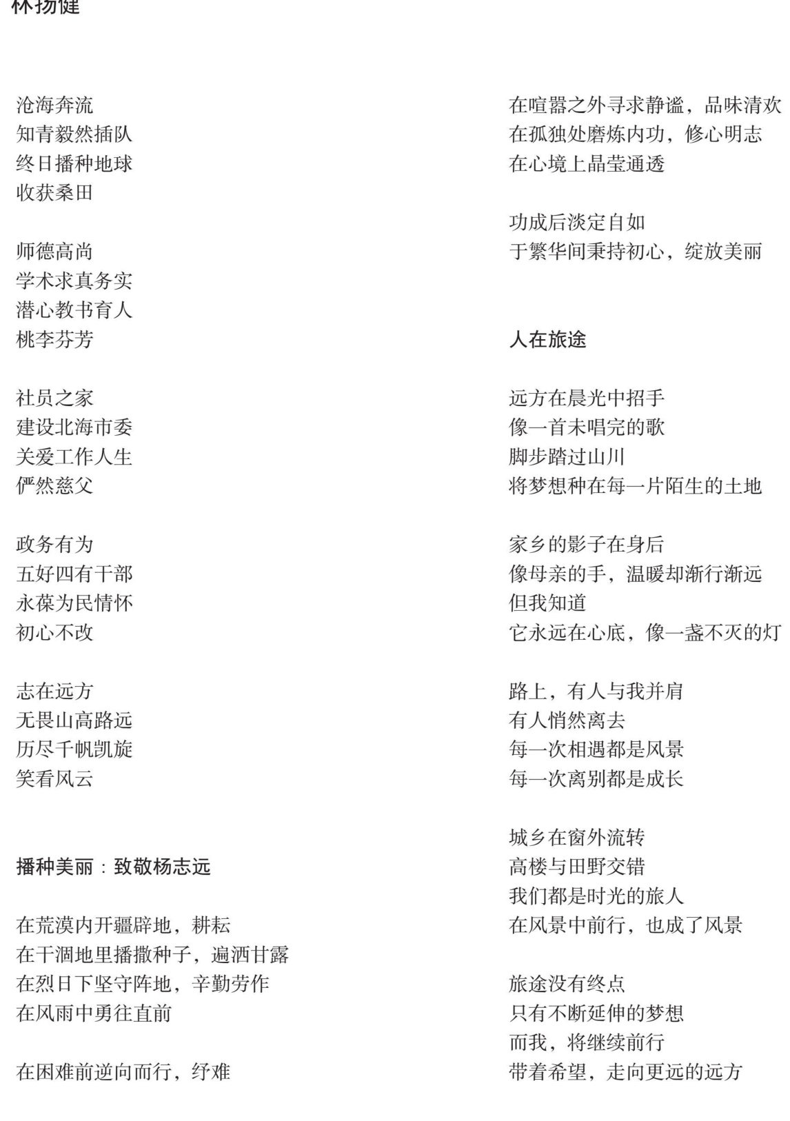 沧海奔流 知青毅然插队 终日播种地球 收获桑田 师德高尚 学术求真务实 潜心教书育人 桃李芬芳 社员之家 建设北海市委 关爱工作人生 俨然慈父 政务有为 五好四有干部 永葆为民情怀 初心不改 志在远方 无畏山高路远 历尽千帆凯旋 笑看风云 播种美丽:致敬杨志远 在荒漠内开疆辟地,耕耘 在干涸地里播撒种子,遍洒甘露 在烈日下坚守阵地,辛勤劳作 在风雨中