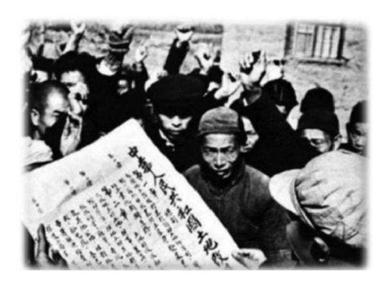 1949年中华人民共和国成立,当时占全国3亿多人口的新解放区还没有进行土地改革,广大农民迫切需要进行土地改革获得土地。1950年6月,中央人民政府颁布了《中华人民共和国土地改革法》,作为在全国新解放区实行土地改革的法律依据。《土地改革法》颁布后,土改运动轰轰烈烈地开展起来。上图反映的就是农民手拿《土地改革法》,积极参加土改运动的场景。从图片可以看出,人民群众欢欣鼓舞,喜极而泣。由于获得了世代渴望的