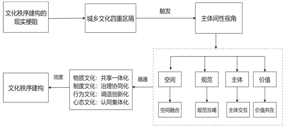 摘要:城乡融合发展中的文化秩序构建,实质是对城乡中国的价值回应和文化解释。面对社会变迁中形成的城乡文化区隔,蕴含融通性生存智慧的主体间性哲学可为其将提供新的方法论启示。以主体间性审视城乡物质、制度、行为、心态文化的四重区隔,以“关系”切入并选取其重要影响因子,搭建空间一规范一主体一价值四维分析框架,有助于通过空间融合、规范互哺、主体交互、价值共在实现城乡物质文化共享一体化、制度文化治理协同化、行为文化调适创新化、心态文化认同集体化,由此推动城乡融合型文化秩序的构建,以文化融合促进城乡协调发展。